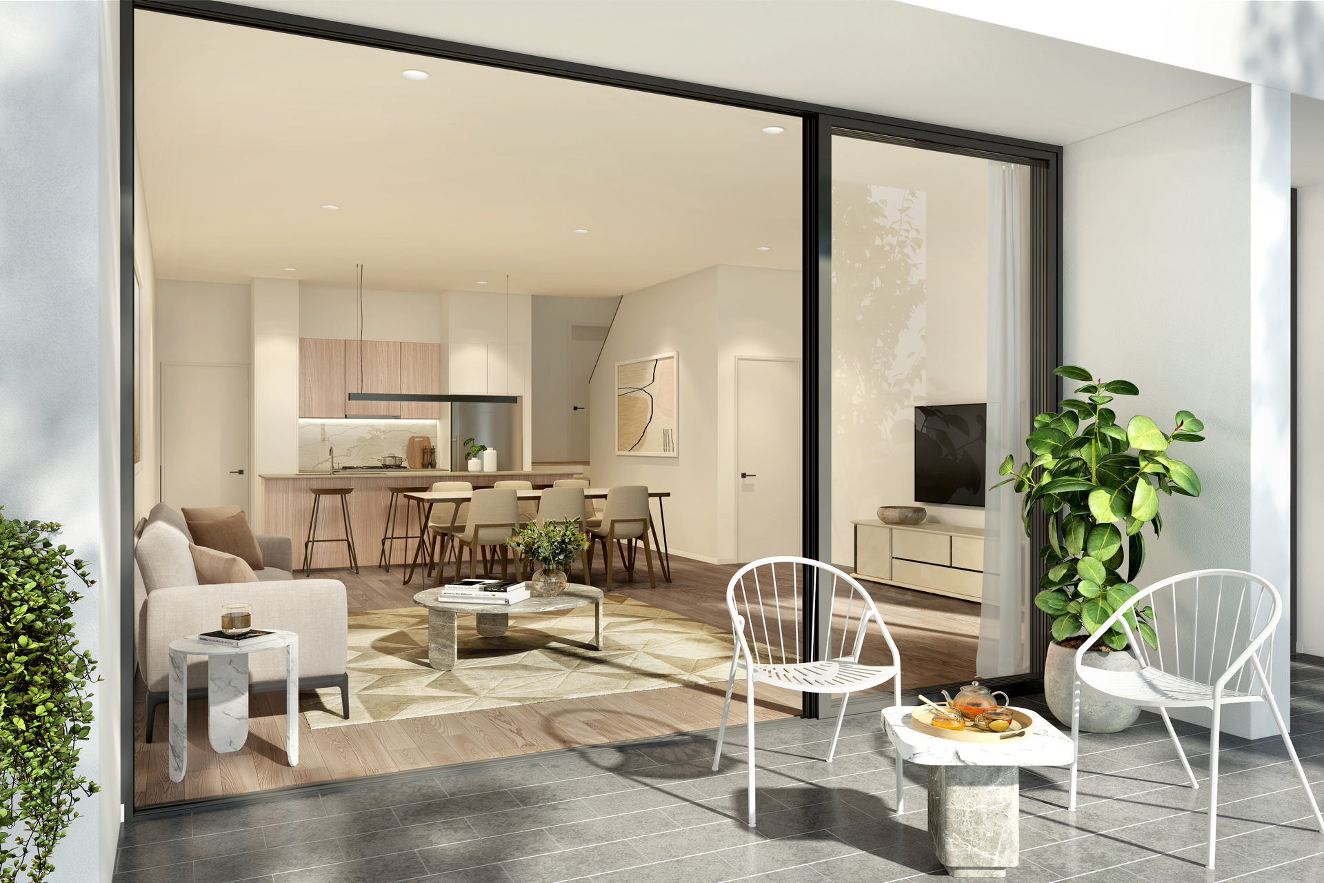 The open-plan living area is perfect for entertaining family and friends, featuring soaring 2.7m ceilings and glass sliding doors that create a seamless connection to the outdoor terrace. Enjoy far-reaching northerly views over the private residents’ community garden – a peaceful space to relax and connect with friends and neighbours within the greater Hamilton Hill reserve.