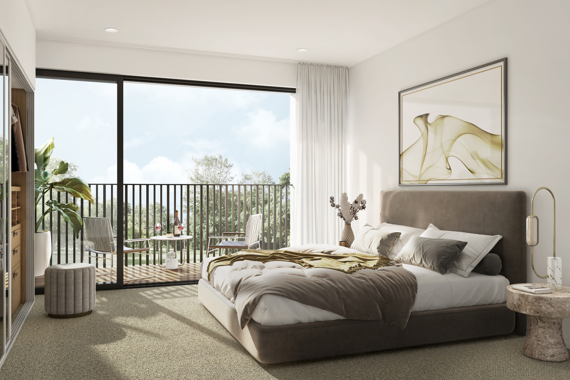 The master suite features a luxurious en-suite with a shower and double vanity, plus a north-facing balcony – an ideal spot to relax with your morning coffee or evening drink while taking in the views. Two additional bedrooms offer built-in robes and access to a stylish family bathroom with a bath, providing comfort and convenience for the whole family.