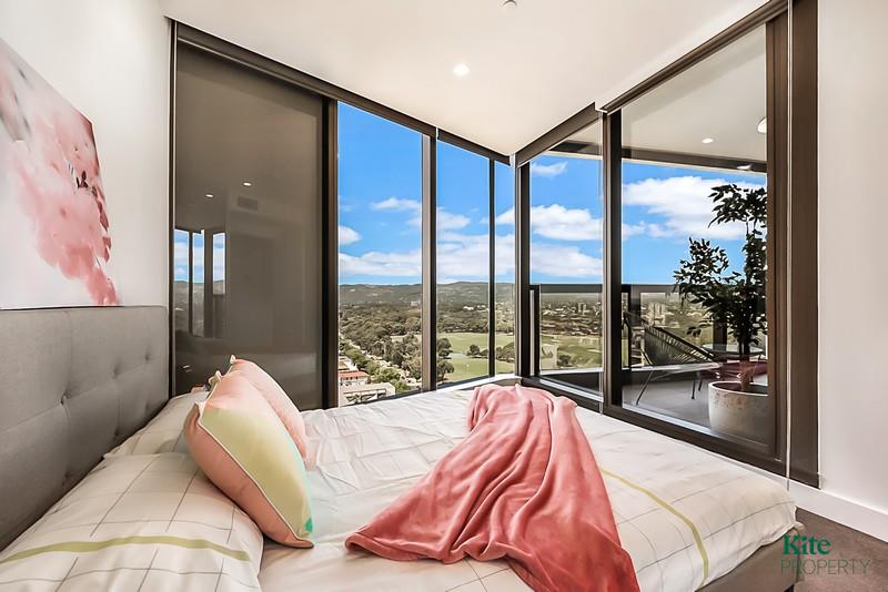 This particular apartment is treated to panoramic floor to ceiling windows in the main living space, with sleek blinds for privacy. Uniquely featuring a partition wall in the living area, offering the perfect backdrop for your TV or wall art, whilst creating a separate space for dining if you wish. The bedroom's built-in robe provides ample storage, and the bathroom offers generous mirror space & cupboard storage.