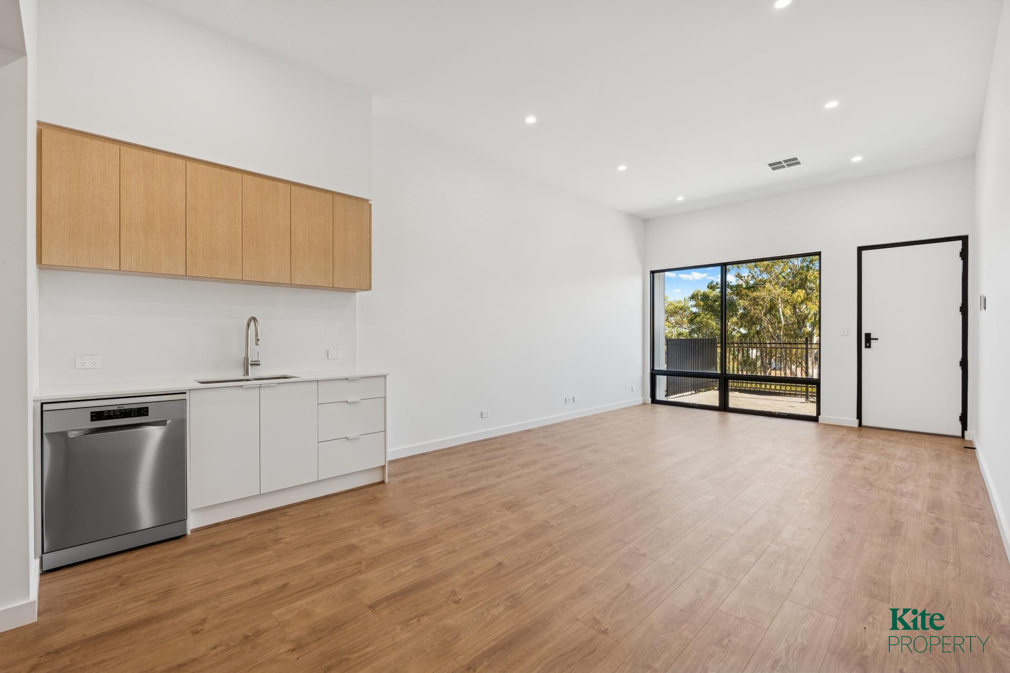 – Open-Plan Living: Spacious lounge with 2.7m ceilings and sliding doors opening to an outdoor terrace with north-facing views over the private community garden.