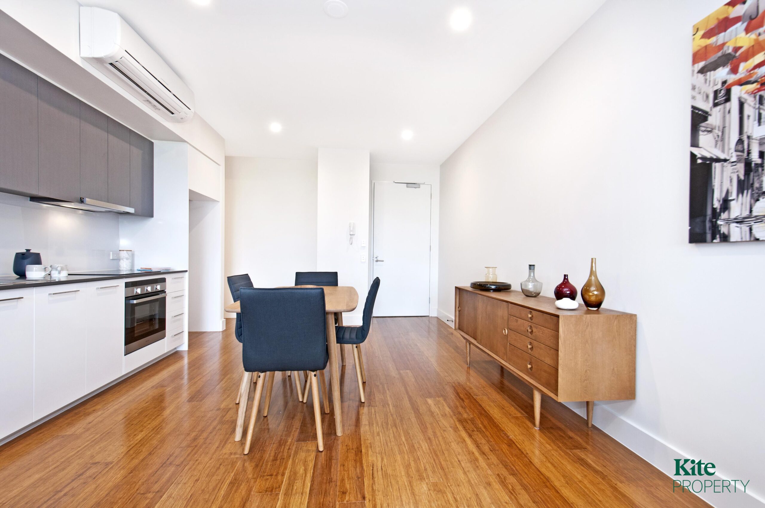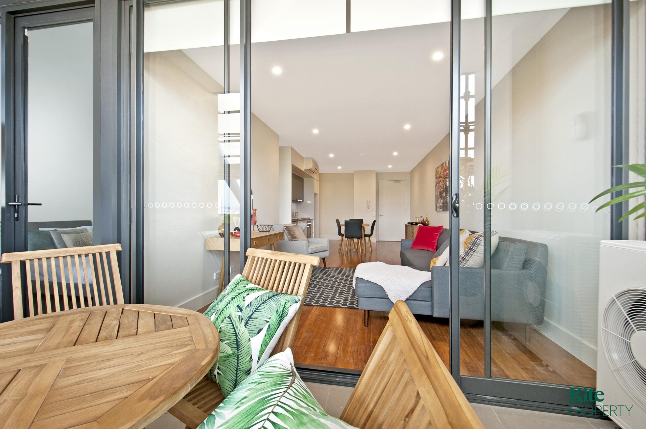 – Open plan living/dining area with floorboards, opening onto a private balcony