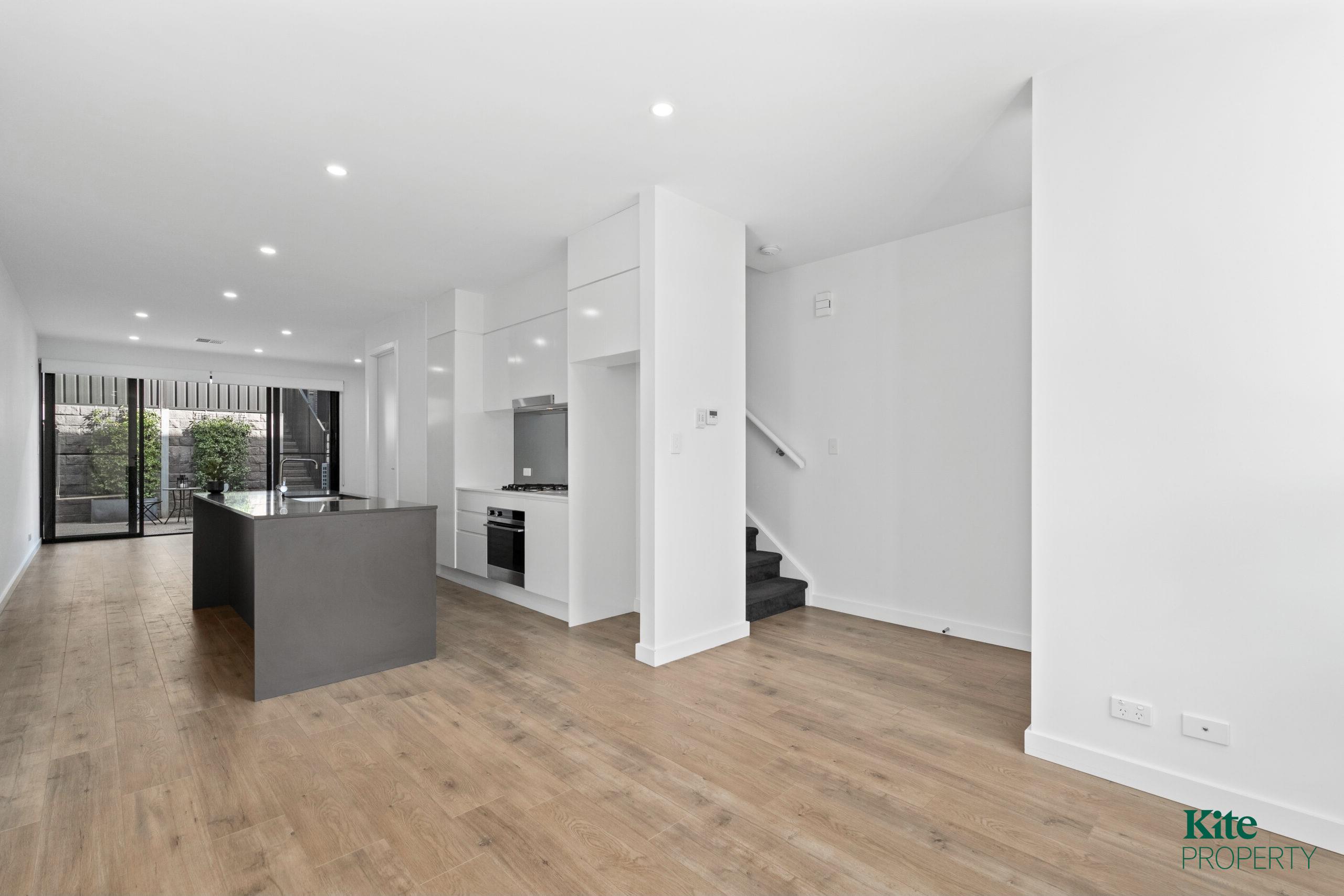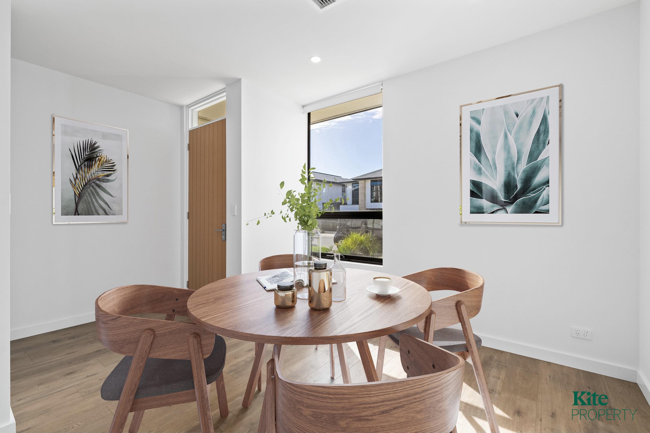 – Enter into a welcoming open-plan dining area that flows seamlessly into the sleek, light-toned kitchen featuring a central island, ample cabinetry, and a dishwasher.