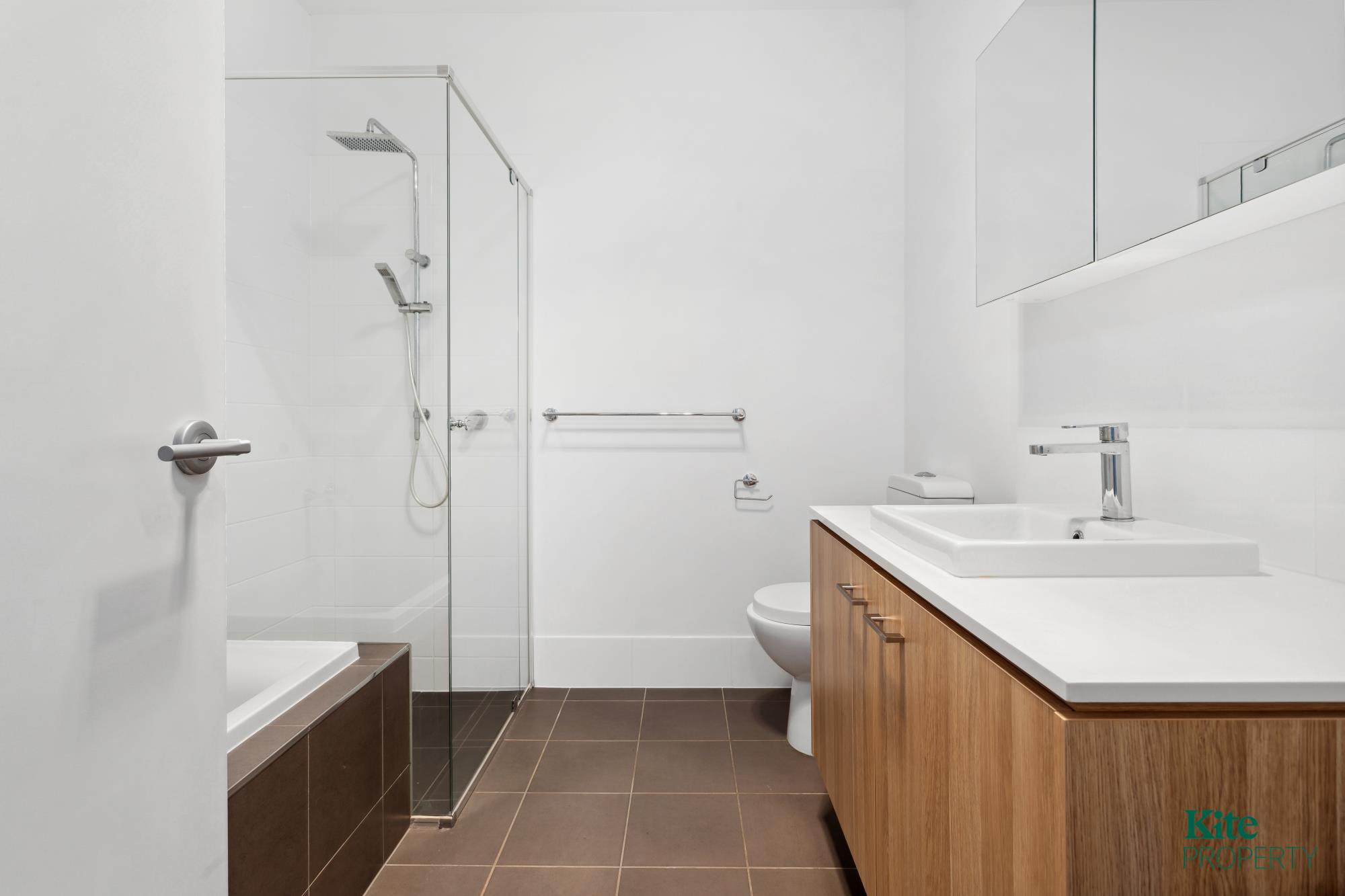 – A spacious family bathroom includes a full-size bathtub, separate shower, and sleek modern finishes.