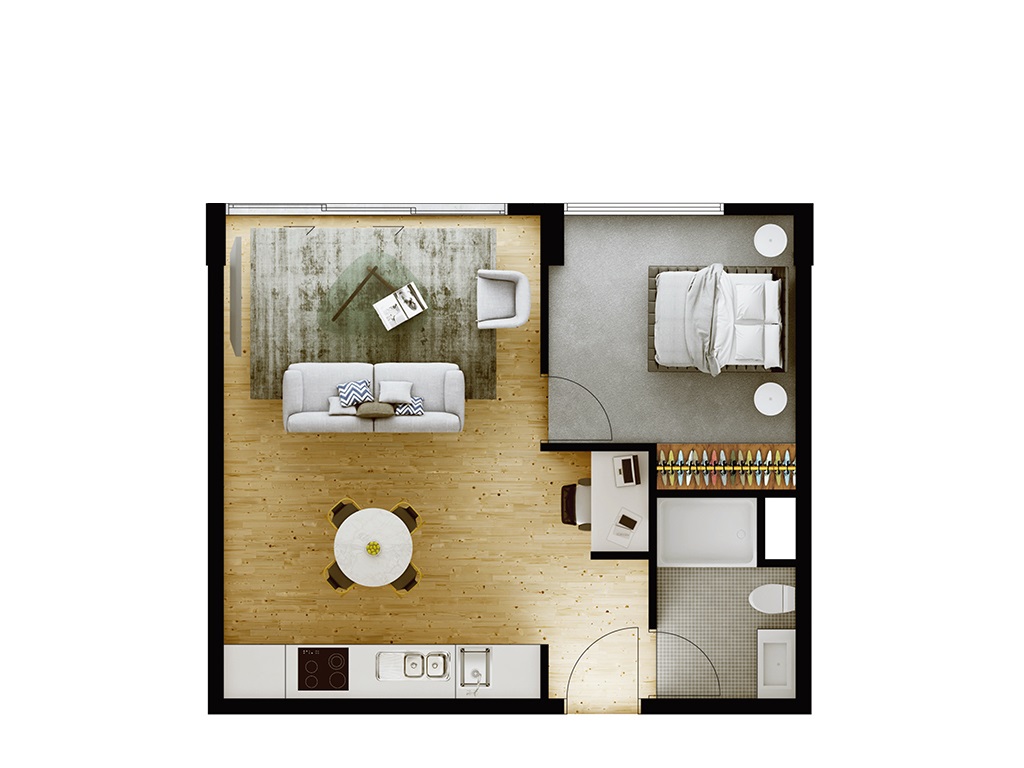 Designed for easy indoor/outdoor living, these apartments embrace the energy of the city while providing a peaceful place to unwind at home, with views stretching from the city to the surrounding hills. This apartment is particularly special as it has a unqiue balcony that wraps around the entirety of the apartment.
